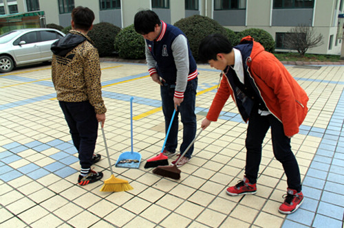 以正门为中心分别向行政楼与食堂方向进行清扫。一批干事自行政楼前开始清扫工作,向教学楼方向移动,直至图书馆前,期间,面对那些被人扔在地上的烟头,干事们亲手拾起,毫无嫌弃之意。另一批干事自体育馆前开始一路清扫,途径食堂,直至校园超市门口。
