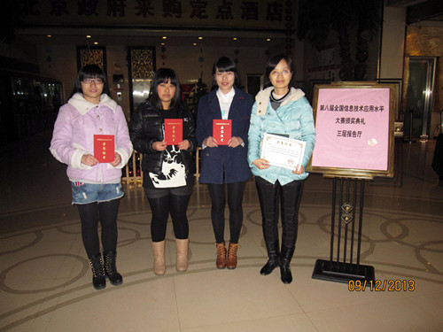 2013年12月6日-9日,由教育部教育管理信息中心组织的第八届全国信息技术应用水平大赛决赛在北京航空航天大学举行,来自全国31个省697个学校1000多支参赛队伍参加了本次决赛。我校商务系和计算机信息技术系共有两支队伍进入决赛。商务系电子商务专业樊西峰老师和张琼老师共同指导了两支电子商务运营队伍参加大赛,其中一队进入决赛,这也是商务系首次进入全国信息技术应用水平大赛决赛。面对强手如林的各路本科、高职、中职院校在校学生,商务系12电商4班三名女生周琼、钱赵娜、郭蓉没有畏怯,她们在老师的悉心指导下精心准备、从容演示、应答。在107个电子商务与互联网金融决赛队伍中,该团队经过激烈角逐后获得电子商务与互联网金融团体赛全国二等奖的好成绩。商务系樊西峰老师和张琼老师获得最佳指导教师奖。浙江长征职业技术学院获得第八届全国信息技术应用水平大赛的组织奖。