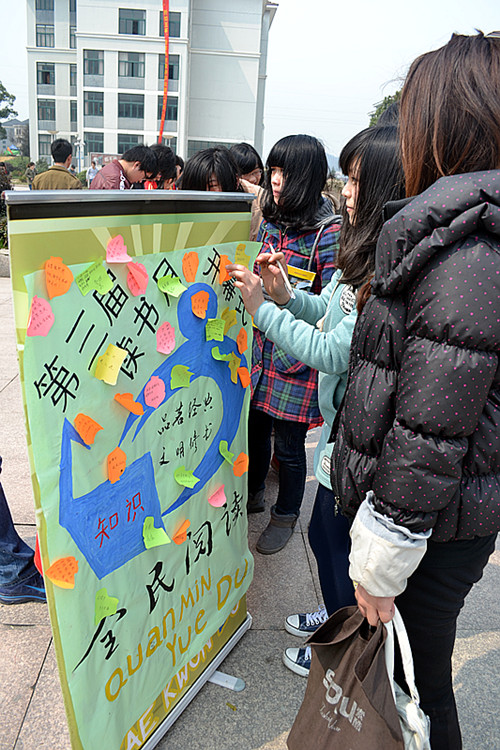 阅读能致远,书香亦修身。为加强学风建设,提升大学生的人文素养,2012年3月22日,由团委、图书馆联合举办的第三届“全民阅读”读书月开幕式活动在我院图书馆前广场展开。