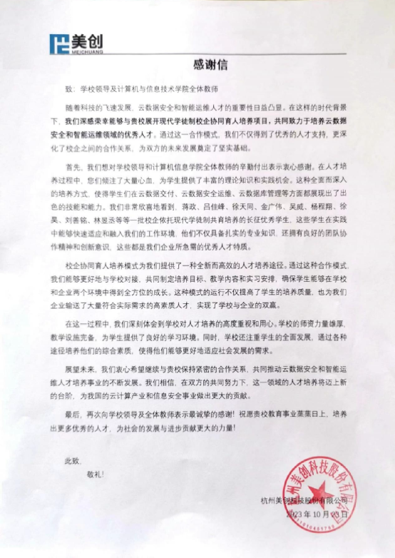 美创科技成立于2005年,是浙江省双软认证企业、国家高新技术企业、省级企业研究院,是通过国家信息安全产品CCC级的上市公司。近年来,为打造企业核心竞争力,公司大力加强人才梯队建设,不断健全完善员工培训体系、晋升体系和薪酬体系,并与我校合作成立了美创现代学徒制班,为学校学生的职业发展提供科学指导和有力帮助。美创科技在信中强调,合作5年多来,学校通过现代学徒制的培养模式,成功为企业输送了一批批具备深厚的专业知识、丰富的实践经验和出色的团队协作能力的高素质云数据安全与智能运维人才,为美创科技的业务发展注入了新的活力,缓解了公司用人之需。